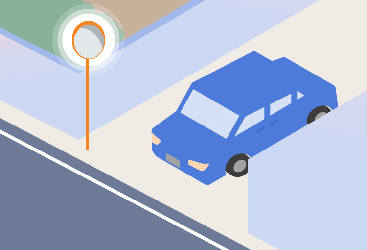 近接センサーと連動して、車両やバイクが近づいていることをカーブミラー外周に設置されたLEDテープライトの点滅でお知らせします。Features03