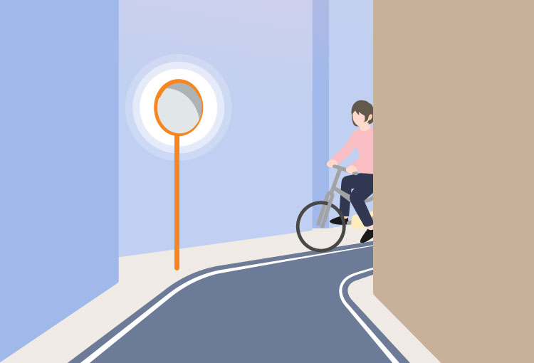 センサーが歩行者や車両を検知すると、カーブミラー外周のLEDテープライトが自動で点滅。見通しの悪い交差点、通学路、工場出入口などに最適です。